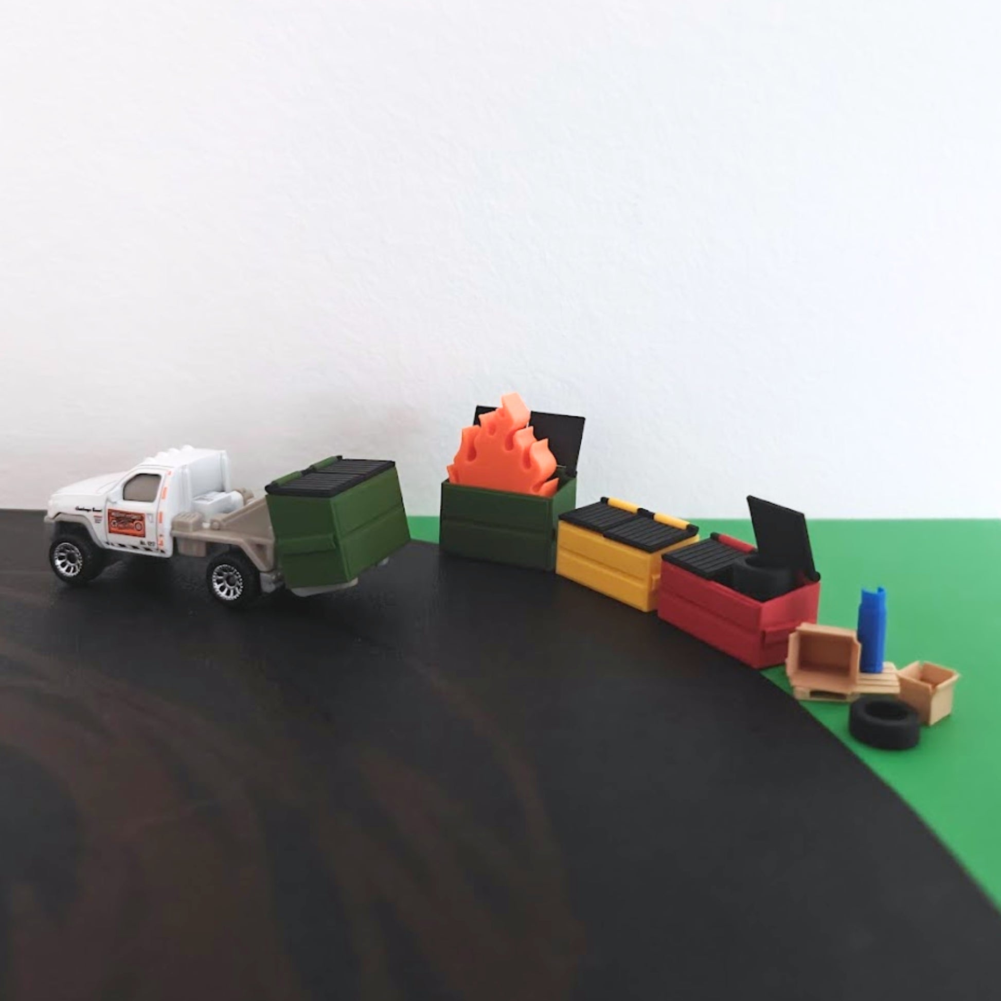 Add extra realism to your 1:64 scale diorama with this miniature dumpster featuring functional opening lids! Perfect detail for street scenes, garages, workshops, or junkyard displays. Each piece is 3D printed with precision to give your setup a true-to-life look.